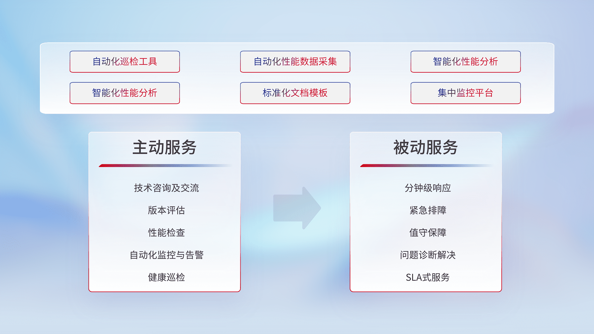 智能化工具和标准化文档,,保障服务质量,,,提供主动服务(包含技术咨询、、版本评估、、、、性能检查、、自动化监控与告警、、、、健康巡检)和被动服务包含(分钟级响应、、、、紧急排障、、值守保障、、问题诊断解决、、、、SLA服务)。。。。